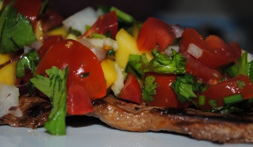 4. When steaks are done, add the salsa to the top of the meat for a pretty presentation, or on the side for those who prefer it that way.