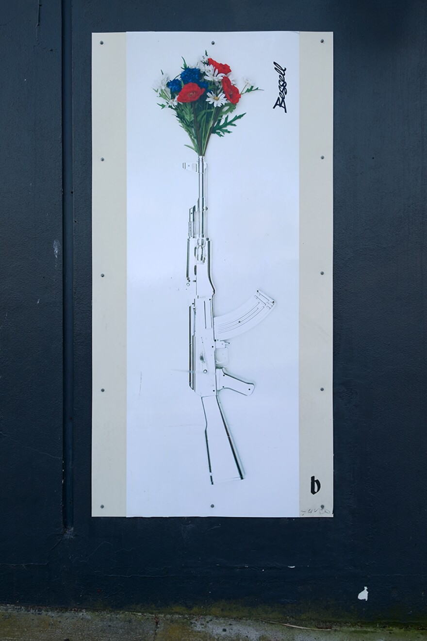 One of Tim Bessell's works on the outside shop wall promised a very different experience of the surfing world inside.
