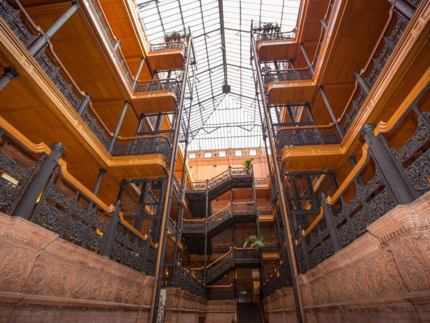 cop shows from Dragnet to Bosch. The five-story Bradbury Building (304 South Broadway, right), built in the 1890s, has been the backdrop for Blade Runner and a host of midcentury noir films. And the disorienting, 1970s-era Westin Bonaventure (404 South Figueroa Street) with its concrete and glass towers and exterior elevators, has been seen in more than 50 films and television shows.