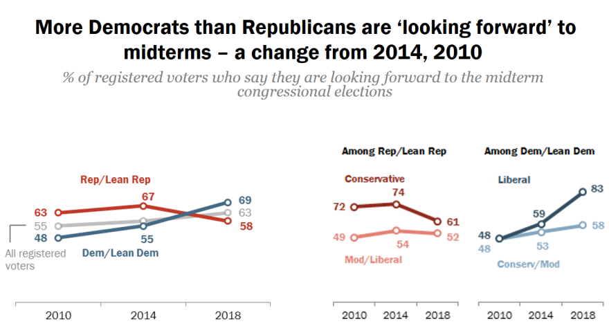 Republicans are also suffering from an enthusiasm gap. As Pew notes in the presentation slide below, more Democrats than Republicans are "looking forward" to the midterms, which is a notable shift from 2010 and 2014, two past midterm years when Republicans took over the House and Senate, respectively.